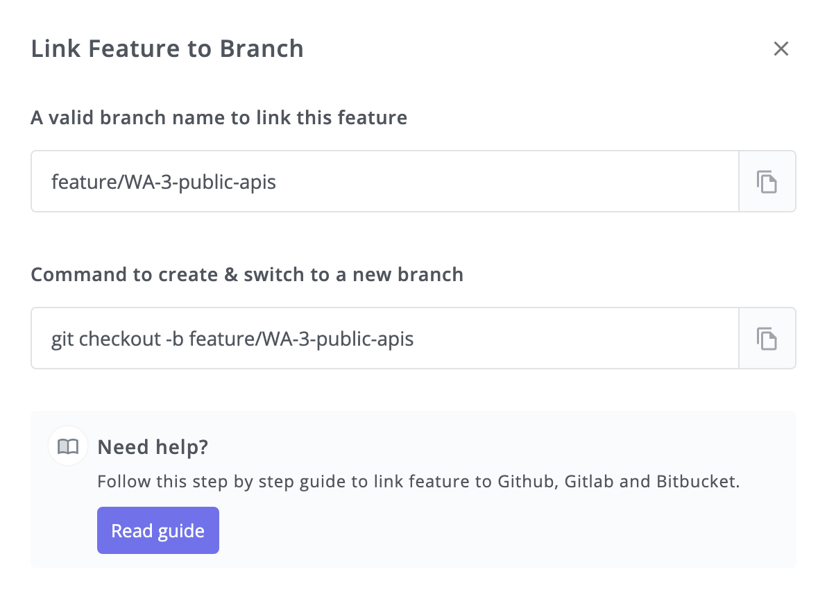 Say you’re working on Public API for your product. You’ll create a feature called Public API in Zepel, create tasks for it, and link the feature to your new Branch using the command suggested by Zepel: