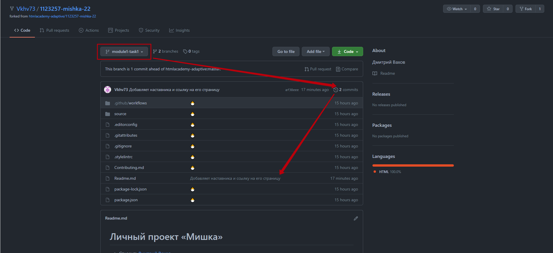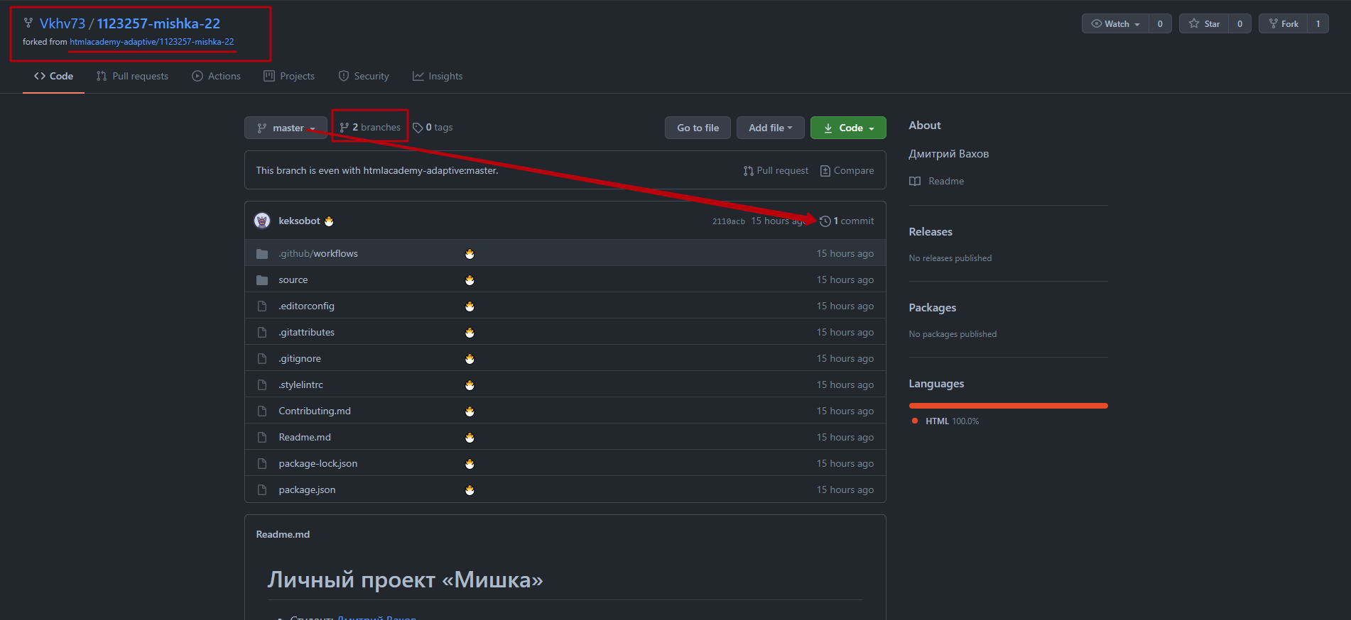 Заходим в форк на GitHub и видим, что ветка появилась. Но в ветке изменений нет. Все верно, поскольку мы работали в ветке , там-то изменения как раз есть.