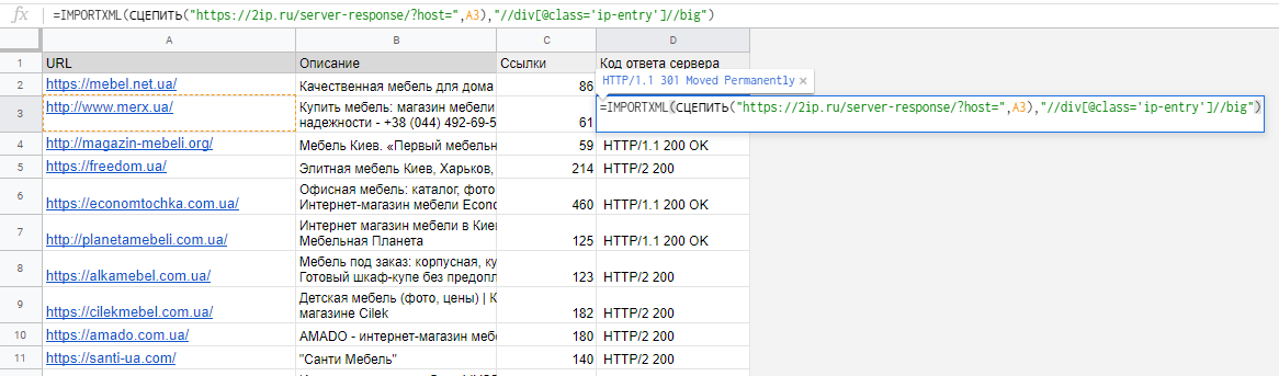 А чтобы быстро проверить коды ответа сервера страниц, подставьте xpath «//div//big» и введите URL онлайн-сервиса, который определяет код ответа сервера страниц. Формула будет выглядеть так: