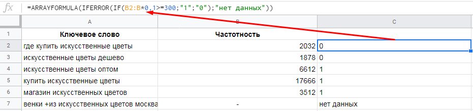 Составляем выражение IF, которое будет возвращать значение 1 для ключей, который приведут минимум 300 посетителей, и 0 – для остальных ключей: