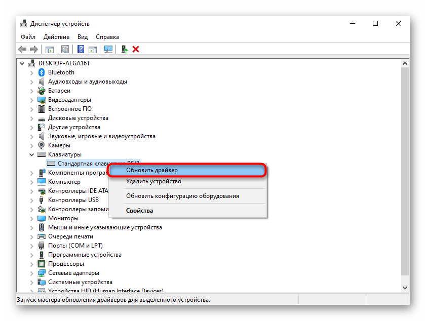 - Снова откройте «Диспетчер устройств» и найдите там свою клавиатуру. Кликните по ней правой кнопкой мыши и выберите пункт «Обновить драйвер».