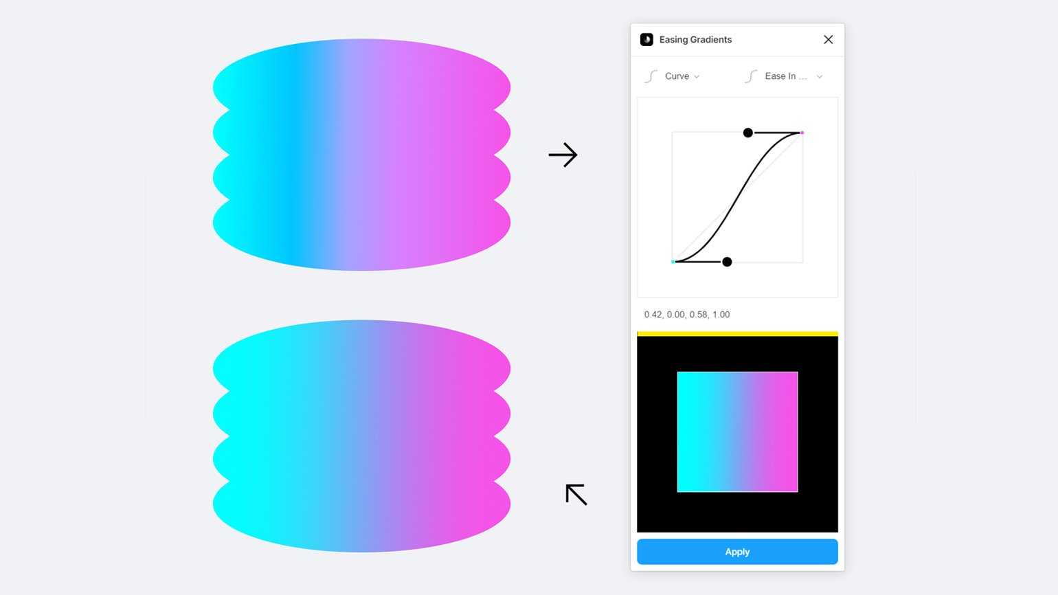 Однако этот метод очень неудобный и долгий. К счастью, в Figma есть плагин Easing Gradients, который позволяет смягчать градиенты автоматически. После его установки нужно выделить фигуру и запустить плагин. В появившемся окне выберите Curve и Easy In Out, после чего нажмите Apply. Если вариант Easy In Out не устраивает, то в окне плагина можно менять настройки.