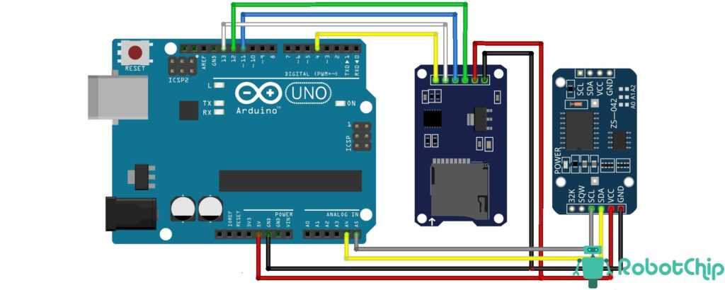 ПодключениеВ примере используем модуль micro SD карты и часы реального времени DS3231, с последнего будем считывать время и показания температуры (раз в три сукунды). Схема не сложная, собираем согласно рисунку ниже.