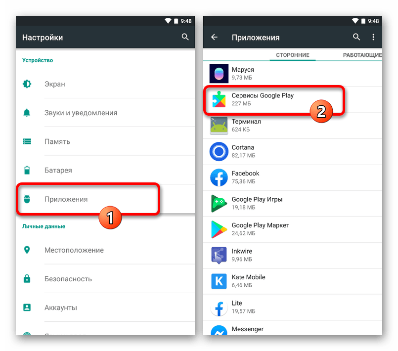- Перейдите в системные «Настройки», разверните раздел «Приложения» и выберите «Сервисы Google Play» из общего списка ПО. В зависимости от версии операционной системы и фирменной оболочки, точные действия могут слегка отличаться.