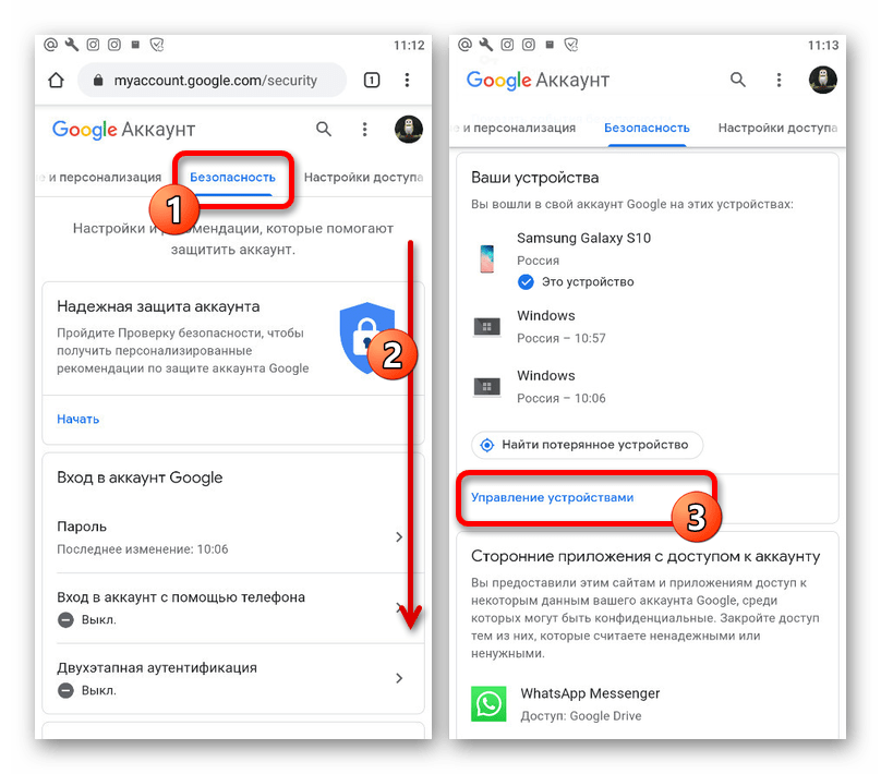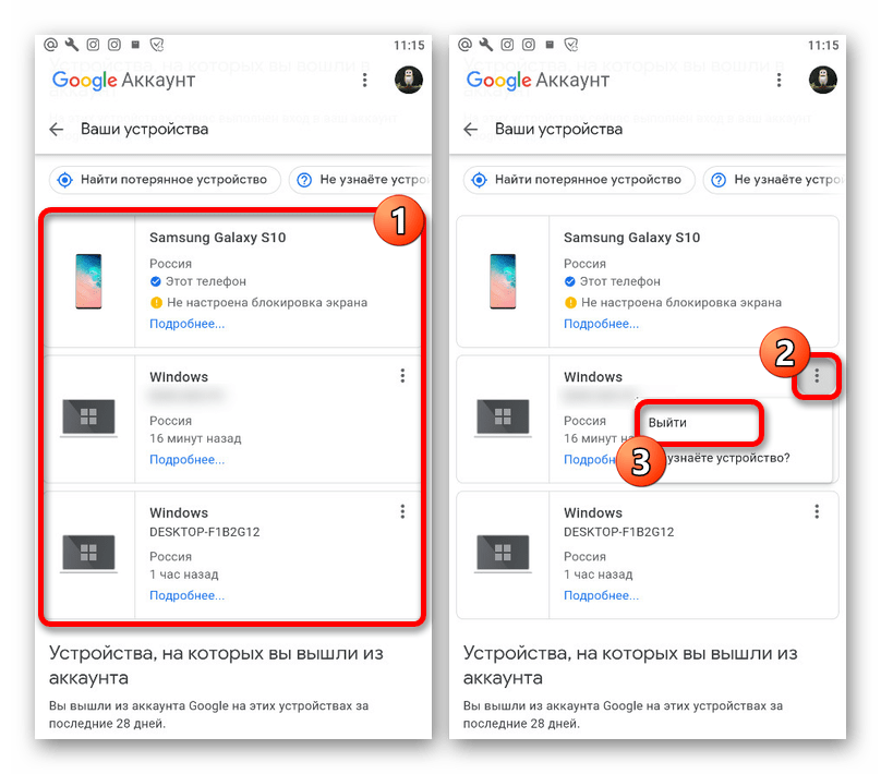 Со смартфона также можно произвести выход из Гугл на любых других устройствах точно такими же способами, как и на компьютере, будь то смена пароля или же самостоятельная деактивация сеансов. Инструкция в равной степени будет актуальна на любых платформах при использовании приложения «Google» или мобильной версии веб-сайта.