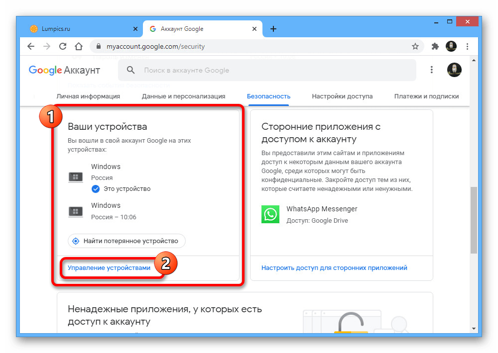 - В качестве альтернативы изменению пароля вы можете выполнить удаление каждого авторизованного устройства по отдельности. Для этого откройте параметры учетной записи, используя указанную нами ранее ссылку, и на вкладке «Безопасность» в блоке «Ваши устройства» коснитесь кнопки «Управление устройствами».