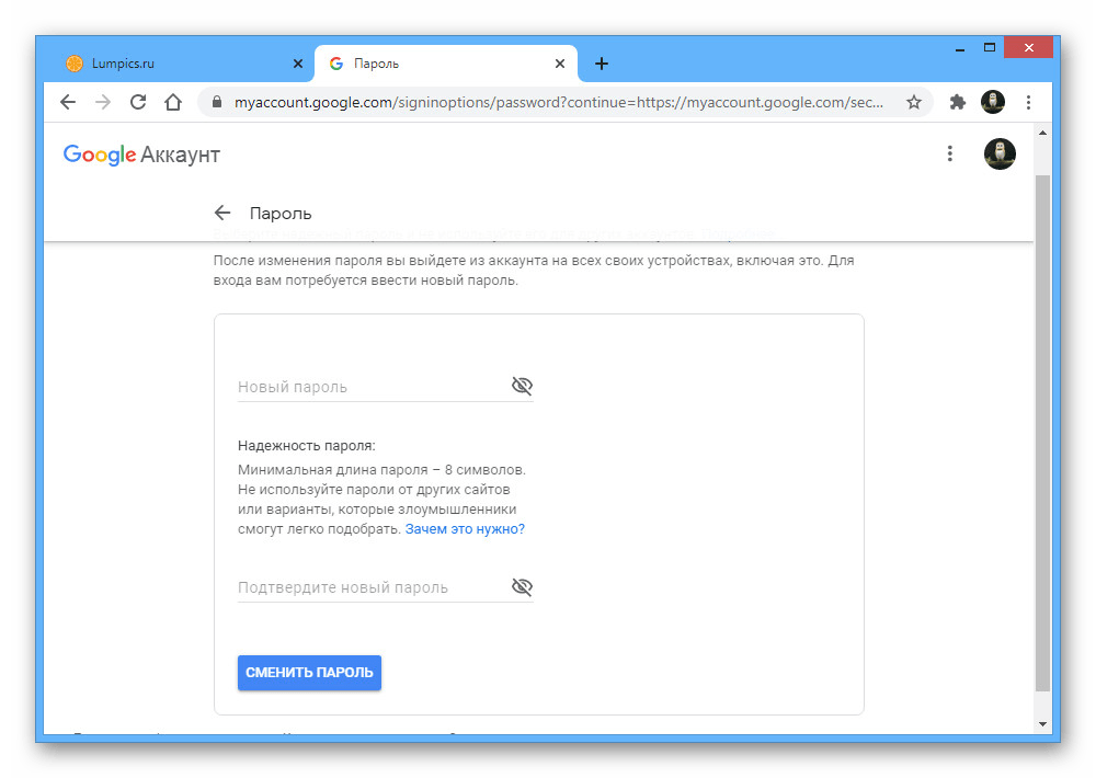 Оказавшись на странице «Пароль», заполните идентичным образом текстовое поле «Новый пароль» и «Подтвердите новый пароль». Выполнить сохранение изменений можно с помощью кнопки «Сменить пароль».