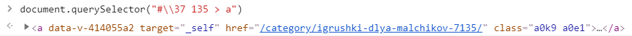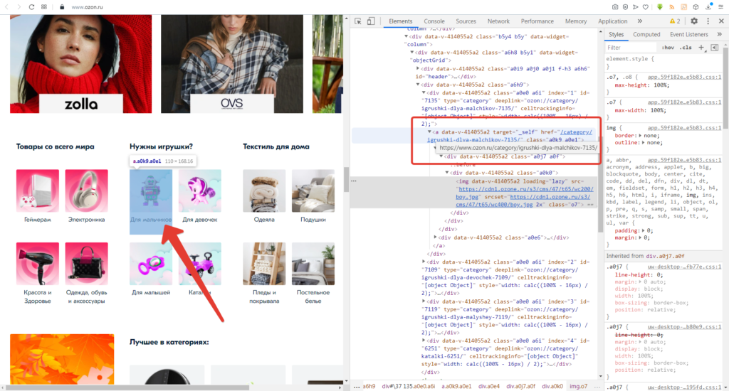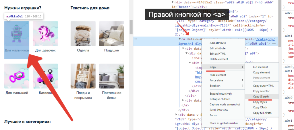 Отловим один элемент <a> с изображением робота и подписью «Для мальчиков». Для этого скопируем в разметке путь JS: