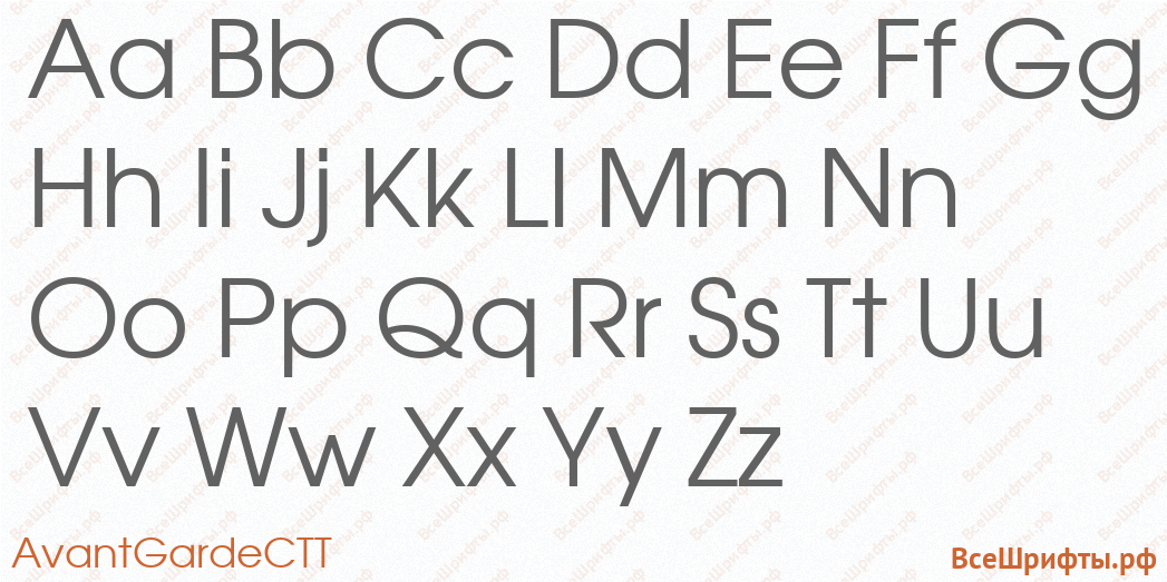 Предварительный просмотр шрифта «AvantGardeCTT» с прописными и строчными латинскими буквами (английский алфавит A-Z и a-z).