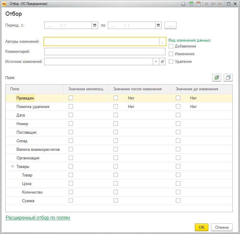 Отбор достаточно гибкий, в том числе можно отбирать по реквизитам объекта, которые в данный момент в объекте уже не существуют (группа Расширенный отбор по полям).