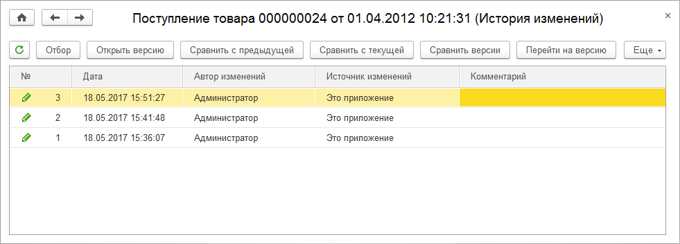 В пользовательском интерфейсе 1С:Предприятия новый механизм называется История изменений. Он включает в себя несколько форм, которые позволяют выполнять те действия, которые были перечислены в начале этой статьи.