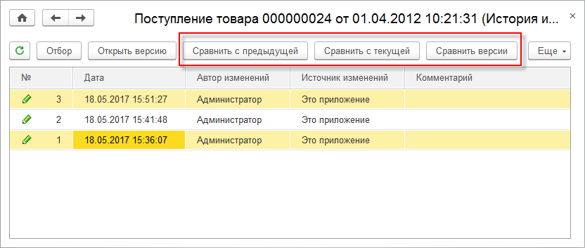Версию, выделенную в списке, вы можете сравнить с предыдущей версией или с текущей версией. Кроме этого вы можете сравнить между собой две произвольные версии, предварительно выделив их в списке.