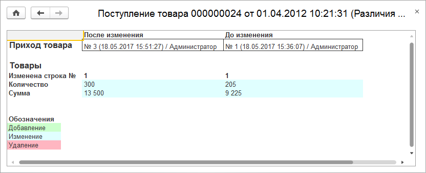 Результат сравнения версий будет также показан с помощью отчёта. Этот отчёт напоминает тот, который используется в БСП. Добавленные, изменённые и удалённые значения подсвечиваются.