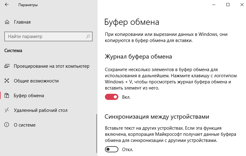 А также появилась возможность не только зайти в буфер обмена и вставить ранее скопированный элемент, но и включить синхронизацию между устройствами. Если эта функция включена, корпорация Майкрософт будет получать данные буфера обмена для синхронизации с другими устройствами.