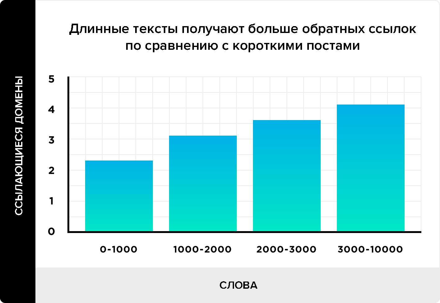 исследовании 2019 года проанализировали 912 миллионов постов в блоге. Текст длиннее 3000 слов получает в среднем на 77,2% больше обратных ссылок, чем материал короче 1000 слов.