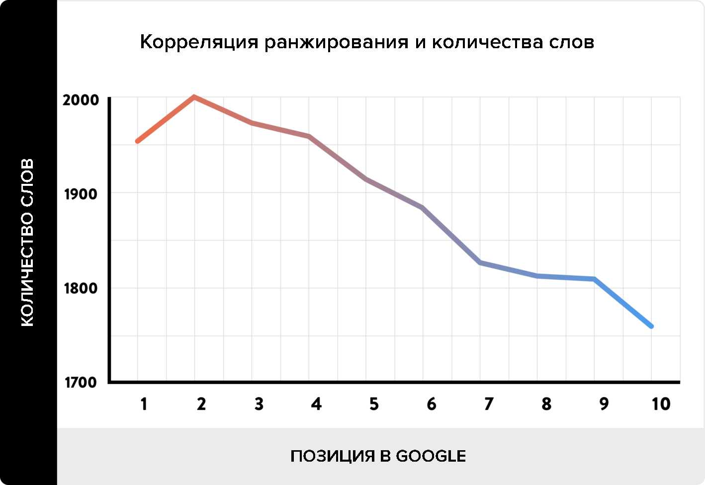Исследование показало корреляцию между длиной текста и ранжированием ссылок на первой странице Google. Из выборки удалили статьи длиной меньше 51 слова и больше 9999 слов. Среди оставшихся лучше ранжировались длинные материалы.