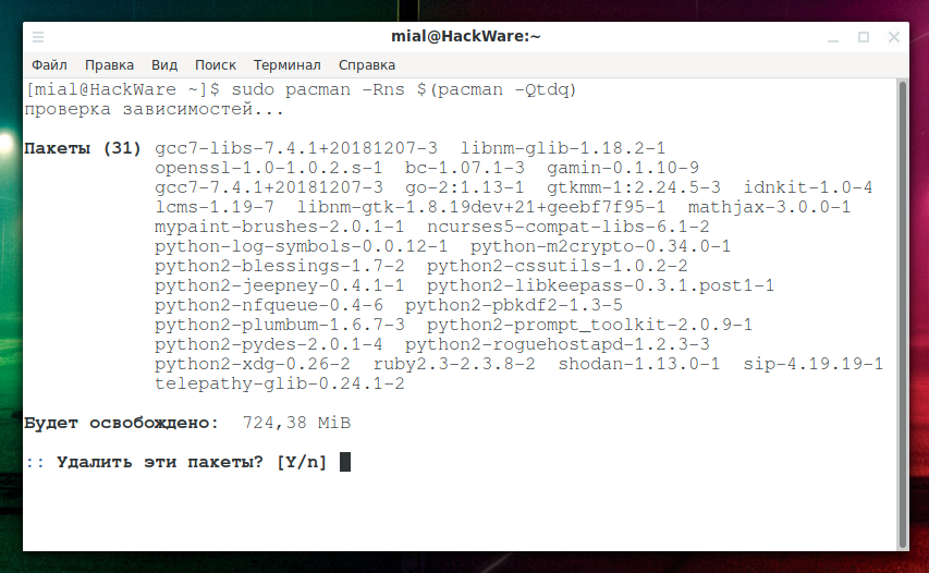 Если осиротевшие пакеты не были найдены, pacman завершит работу с ошибкой: ошибка: не задано целей (для справки используйте -h). Это ожидаемо, поскольку pacman -Rns не получил аргументов.