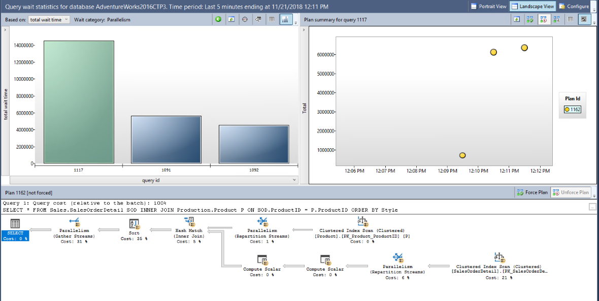 Начиная с SQL Server 2017 (14.x); и База данных SQL Azure, в хранилище запросов доступна статистика ожидания каждого запроса.