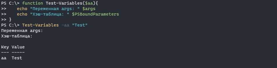 После того, как у функции появляются параметры, переменная «$args» становится пустой. Вместо нее создается переменная $PSBoundParameters. Переменная хранит хэш-таблицу с ключами-значениями: