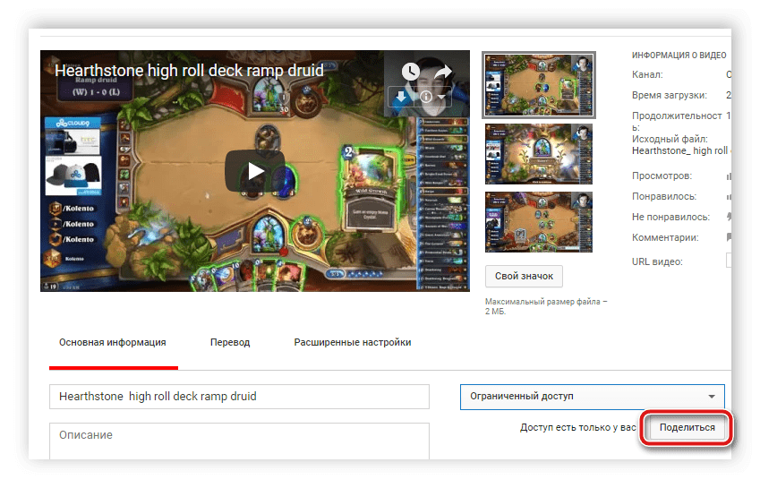 Перейти во вкладку «Видео», указать запись с ограниченным доступом и выбрать «Поделиться».