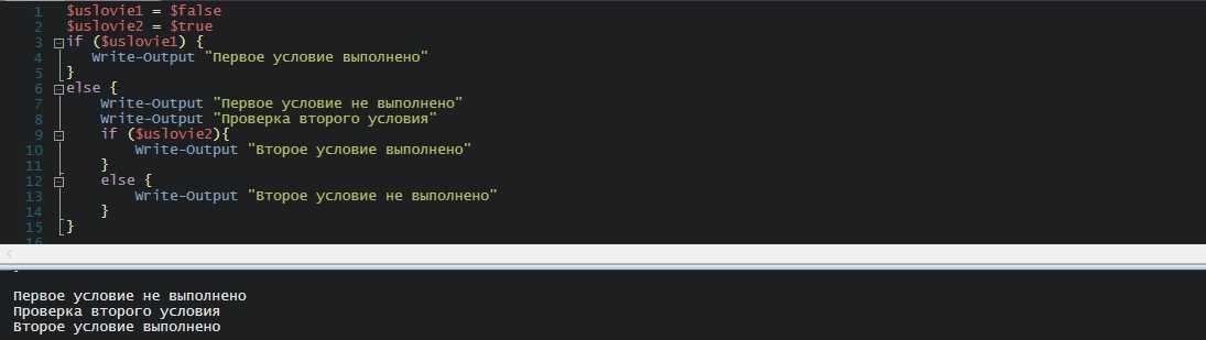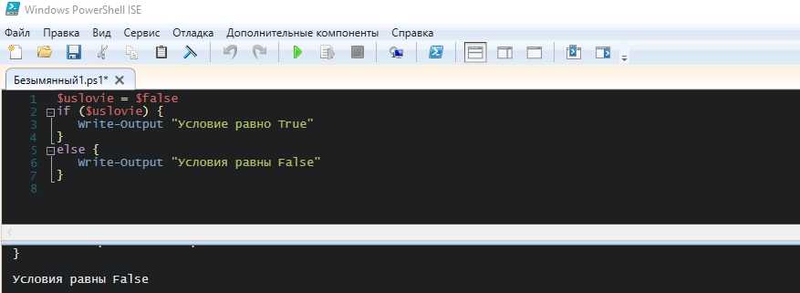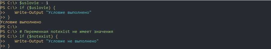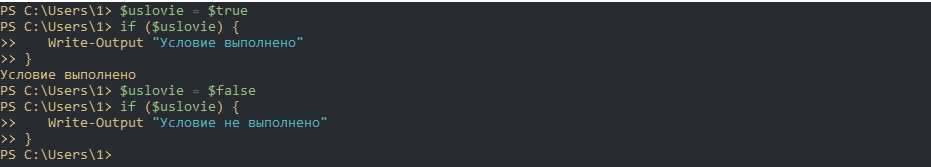 Результат любого сравнение приравнивается к 2 булевым значениям — это True (правда, существует) и False (ложь, не существует, $None). Если вы передаете переменную в условие без каких либо дополнительных операторов, то само существование значения у переменной позволяет выполнить следующую часть и написать «Условие выполнено». Та часть, которая экранируется в фигурные скобки называется ScriptBlock.