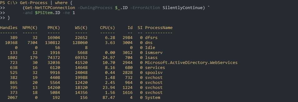В FilterScript так же можно использовать командлеты. Так мы получим все процессы, которые имеют сетевые подключения: