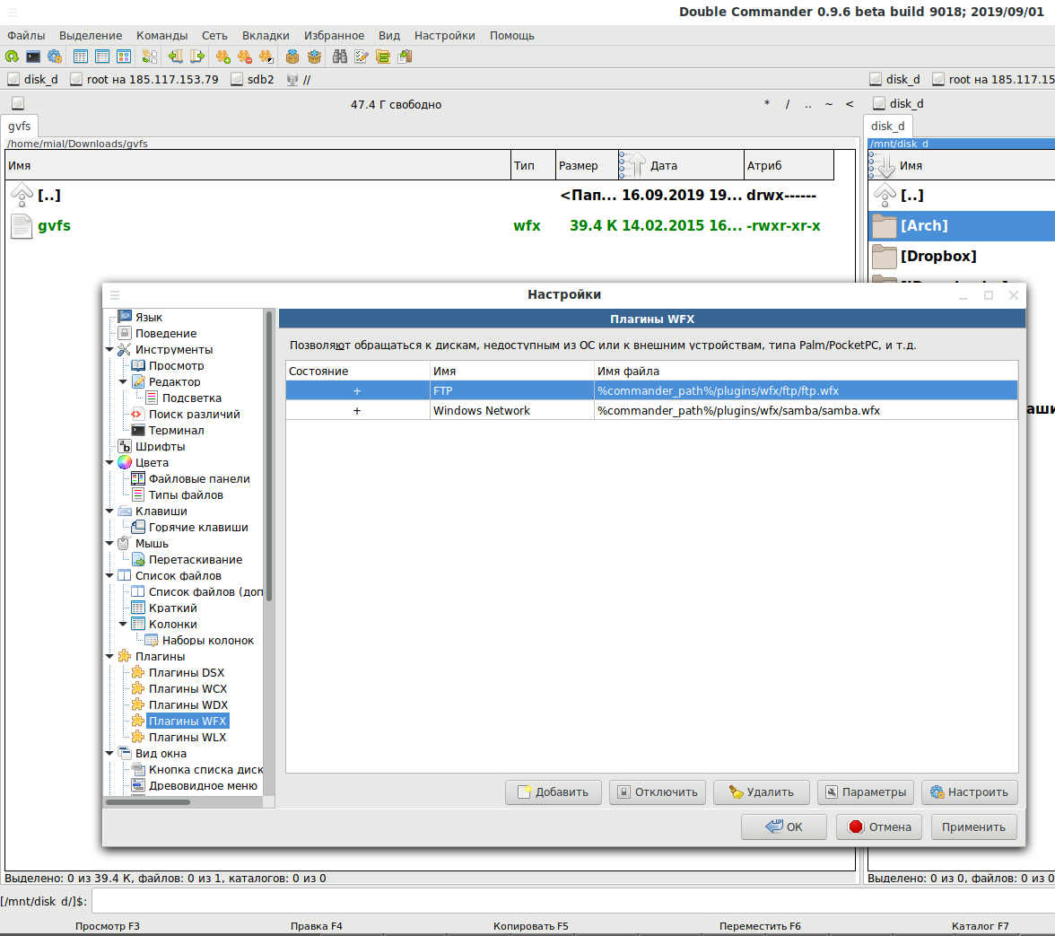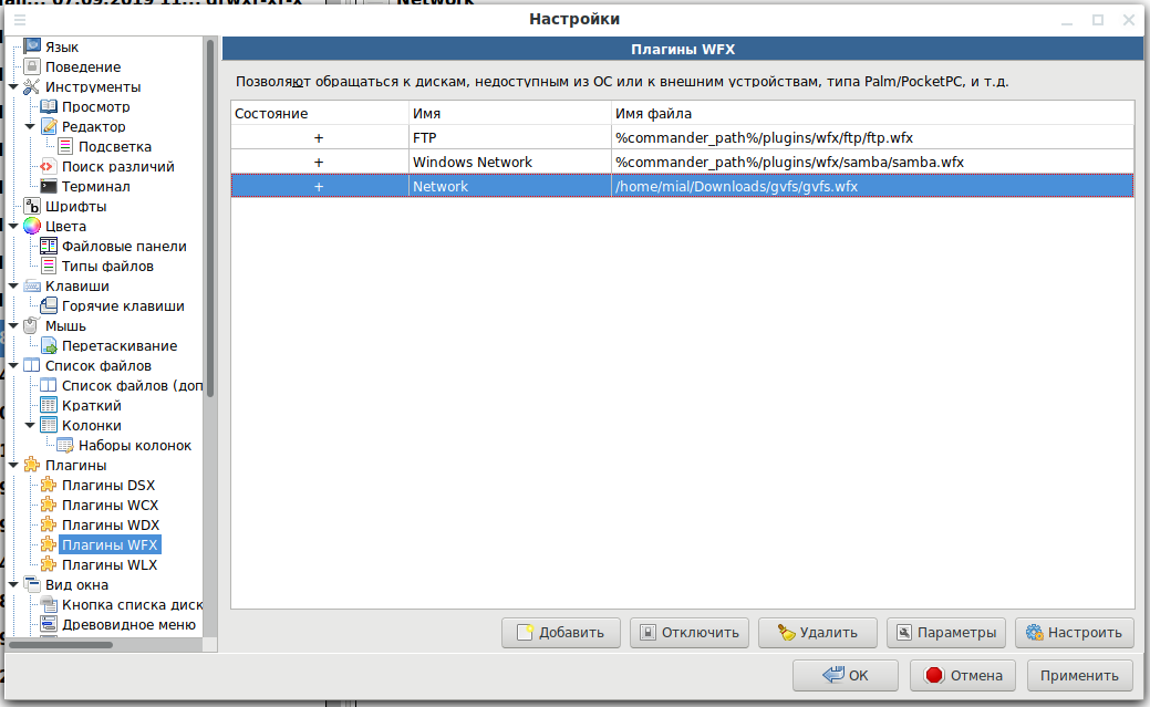 Теперь открываем Double Commander, в меню переходим в «Настройки» → «Параметры» → Вкладка «Плагины» → Плагины WFX.