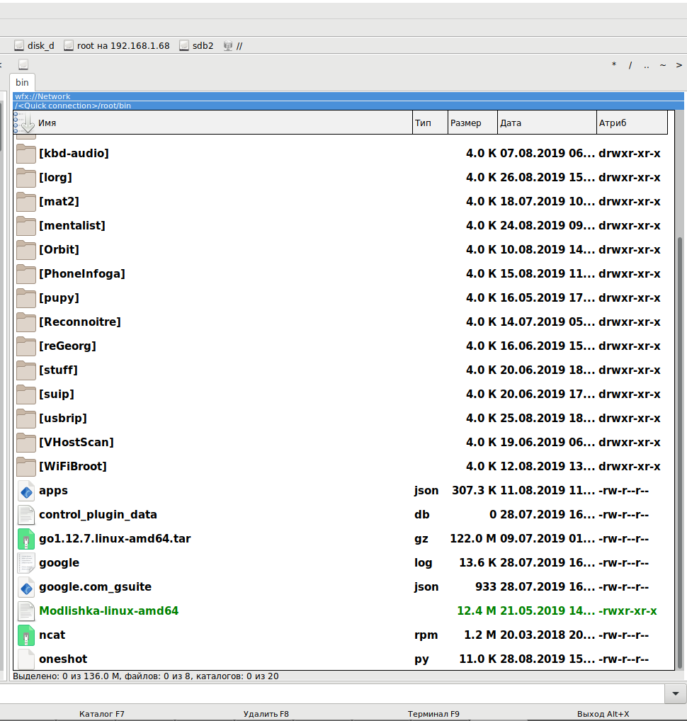 Попадаю на удалённый хост, здесь я могу переходить по папкам, делать различные операции с файлами на удалённом компьютере в двухфайловом менеджере: