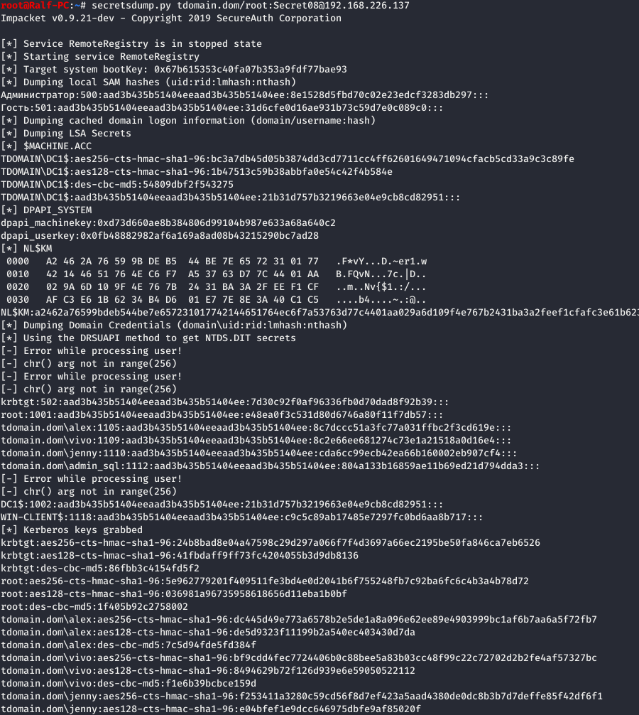 Также при реализации данной атаки можно получить историю паролей учетной записи, точнее NTLM-хеши. Взлом этих хешей позволит понять логику выставления паролей, что, возможно, поможет угадать следующий пароль в случае замены.