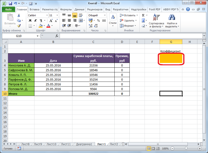 Целевая и искомая ячейка должны быть связанны друг с другом с помощью формулы. В нашем конкретном случае, формула располагается в целевой ячейке, и имеет следующий вид: «=C10*$G$3», где $G$3 – абсолютный адрес искомой ячейки, а «C10» — общая сумма заработной платы, от которой производится расчет премии работникам предприятия.