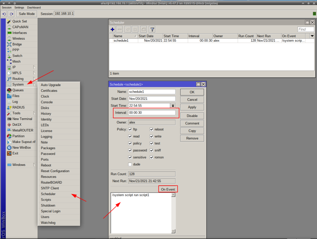 - /tool/netwatch – при доступности или недоступности узла сети;