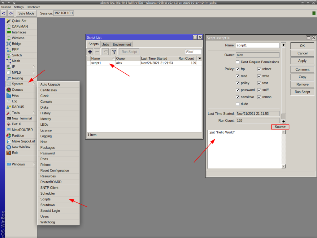 - /ip/hotspot/user/profile – при подключении или отключении hotspot клиента;