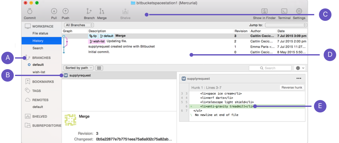 A. Branches list: Lists your Git branches.B. Files list: Includes all the files in your repository.C. Action buttons: Allows you to interact with the repository.D. Commits list: Includes a list of commits to the repository and details of each commit.E. Selected file: Shows a diff of the selected file.