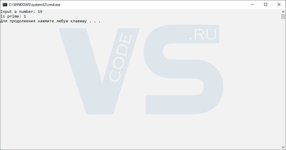 | 1 | intmain() { // в данной переменной будем хранить число, которое необходимо проверить на простоту intn; // вывод текста в консоль printf(«Input a number: «); // читаем число n scanf_s(«%d»,&n); // выводим информацию о том, простое ли число n: 1 — да, 0 — нет printf(«Is prime: %d\n»,isPrime(n)); } |