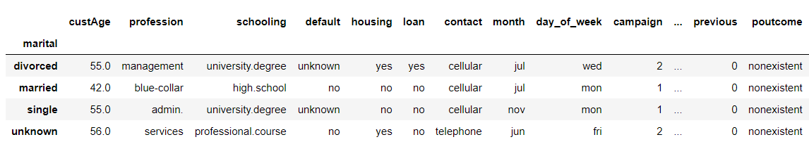 В приведенном выше примере мы использовали функцию groupby() для разделения и отдельного создания нового фрейма данных со всеми данными, принадлежащими столбцу marital, соответственно.