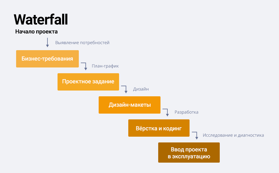 Минус водопадной схемы — процессы идут друг за другом. Это замедляет разработку