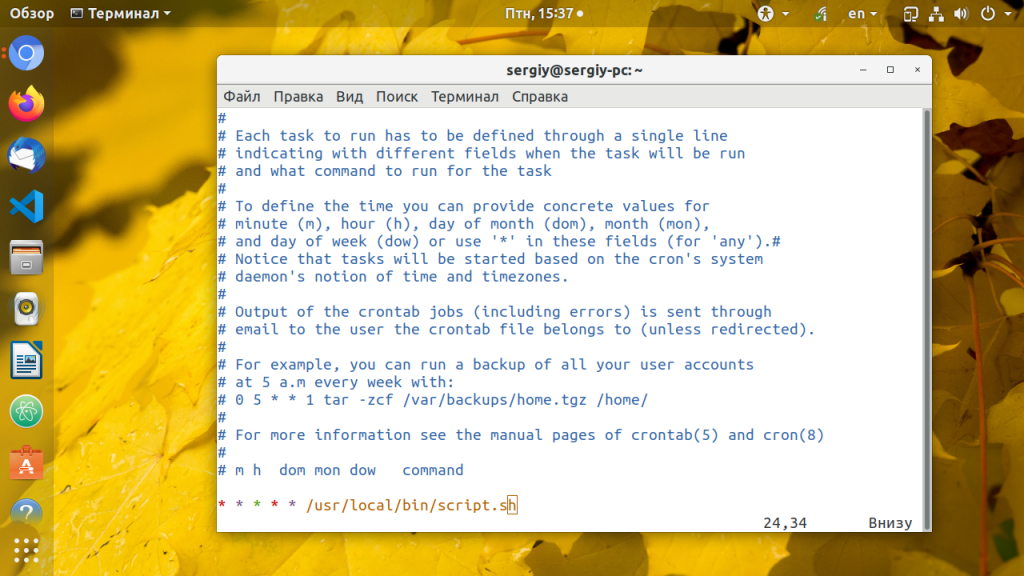 Каждая команда в пользовательском файле crontab занимает одну строку и состоит из шести полей.