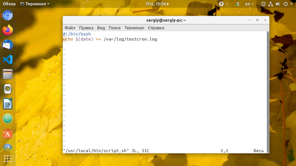Обратите внимание, что значение переменной PATH здесь не действует, поэтому путь надо писать полностью либо объявлять свою переменную PATH в начале файла настройки. Давайте сделаем простой скрипт, который будет выводить в лог дату своего запуска и поможет отладить всё это:
