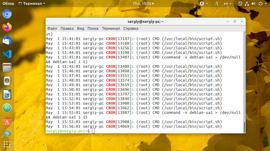 Когда настройка cron linux будет завершена, сохраните изменения и закройте файл. Для этого в Nano нажмите Ctrl+O для сохранения и Ctrl+X для закрытия редактора, а в Vim нажмите Esc и наберите :wq. Теперь новые задания Cron будут добавлены и активированы. Посмотреть как выполняется ваш Cron вы можете с помощью скрипта, который я привел выше либо в лог файле. Сервис cron пишет свои логи в стандартный журнал syslog. В Ubuntu они сохраняются в файле /var/log/syslog:
