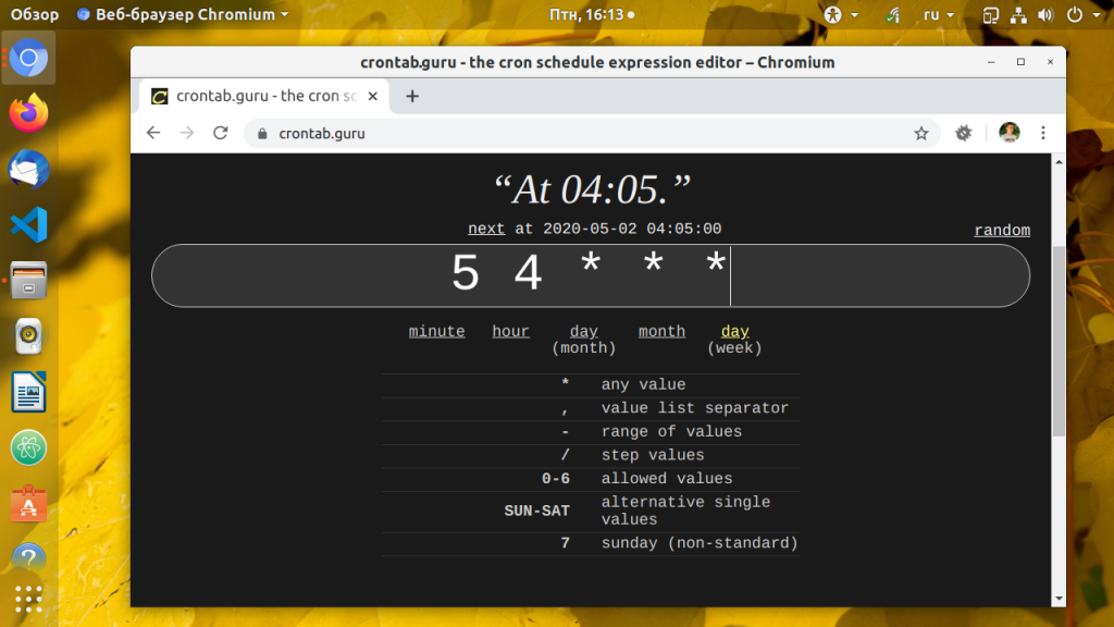 - — Оператор дефиса позволяет указать диапазон значений. Если в поле «День недели» указано , задача будет выполняться каждый будний день (с понедельника по пятницу).