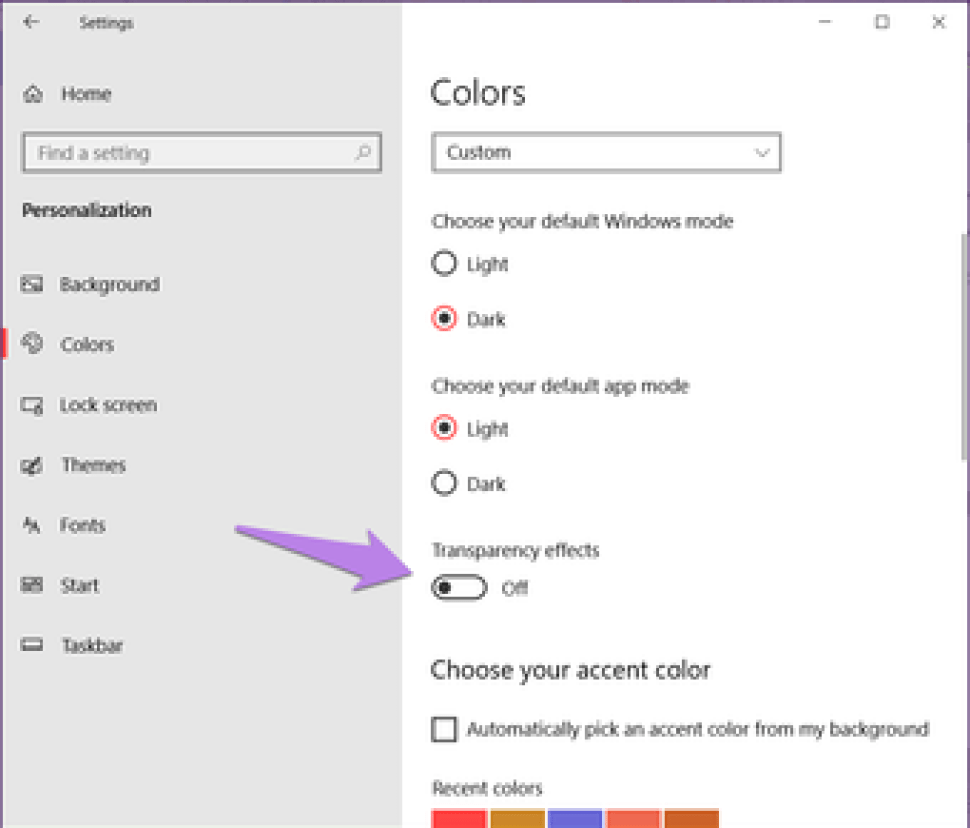 После того, как вы установили акцентный цвет для панели задач, вы можете заметить, что он немного тусклый. Чтобы цвета были яркими, отключите настройки эффектов прозрачности.