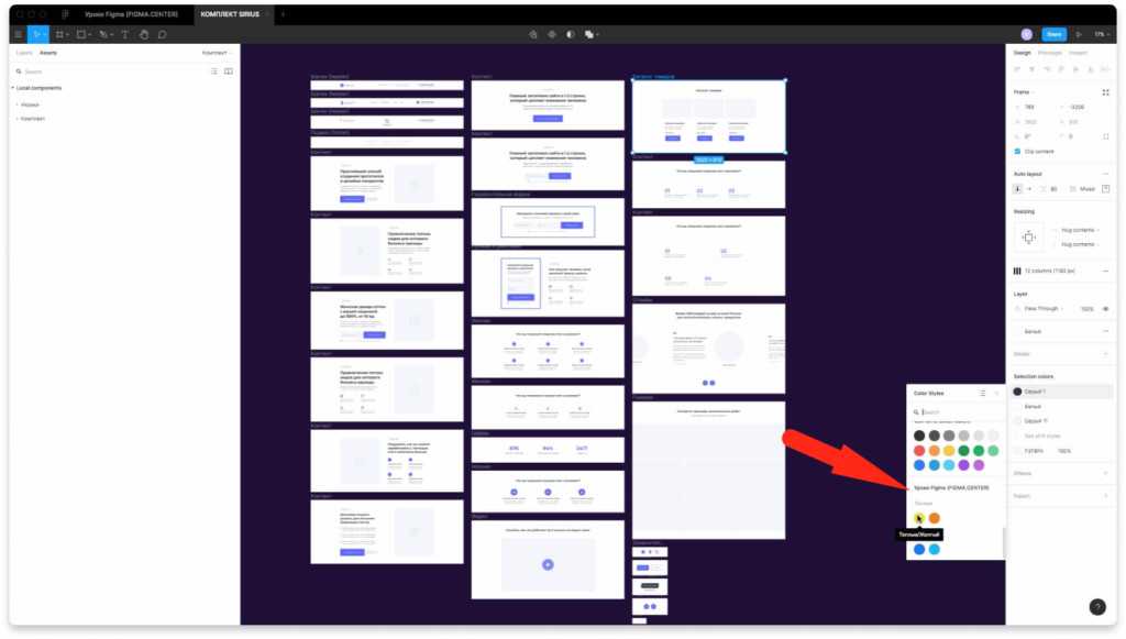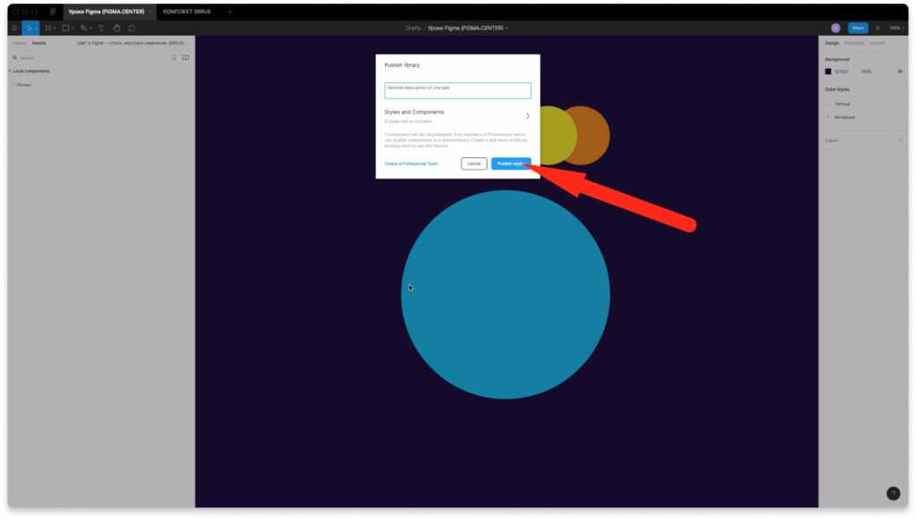 Чтобы использовать стили цвета в фигме повторно в других проектах, нажмите на вкладку «Accets», затем на иконку книги. В появившемся окне нажмите кнопку «Publish».