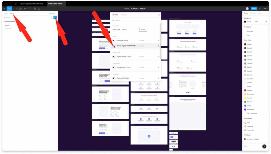 Чтобы использовать опубликованные стили цвета в других ваших проектах, перейдите в новый проект и нажмите на «Accets» и иконку с книгой. В появившемся окне включите тумблер с названием того файла, в котором представлены цвета этих стилей.