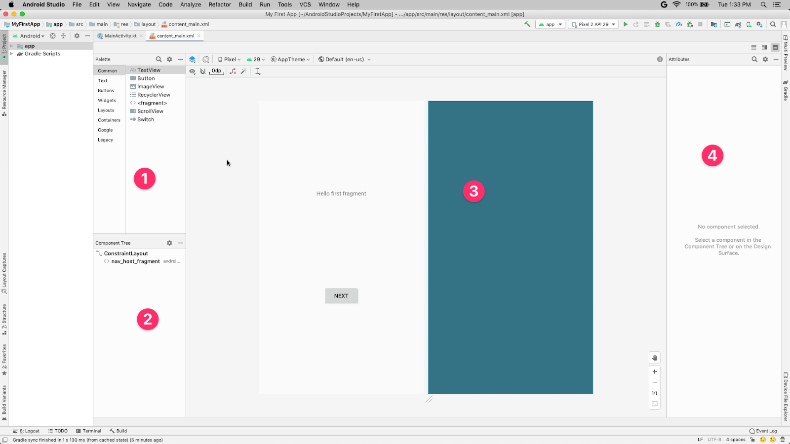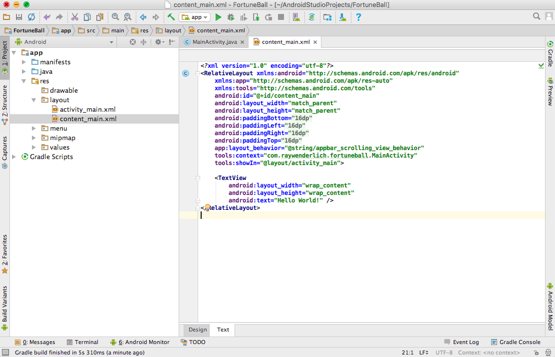 Когда вы завершите создание проекта, Android Studio запустит Gradle для его сборки. Это может занять некоторое время. Когда сборка будет завершена, в Android Studio откроются файлы и . Ваш объект activity может иметь другое название, если вы указали его при настройке.
