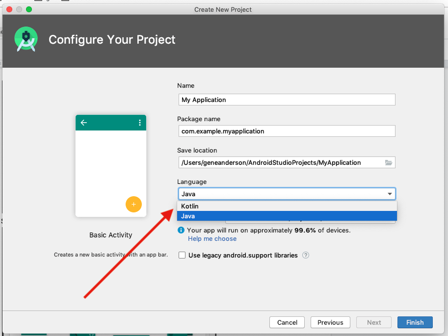 В поле Language (Язык) выберите Java или Kotlin. Maps SDK для Android полностью поддерживает оба этих языка. Дополнительную информацию о Kotlin вы можете найти здесь.