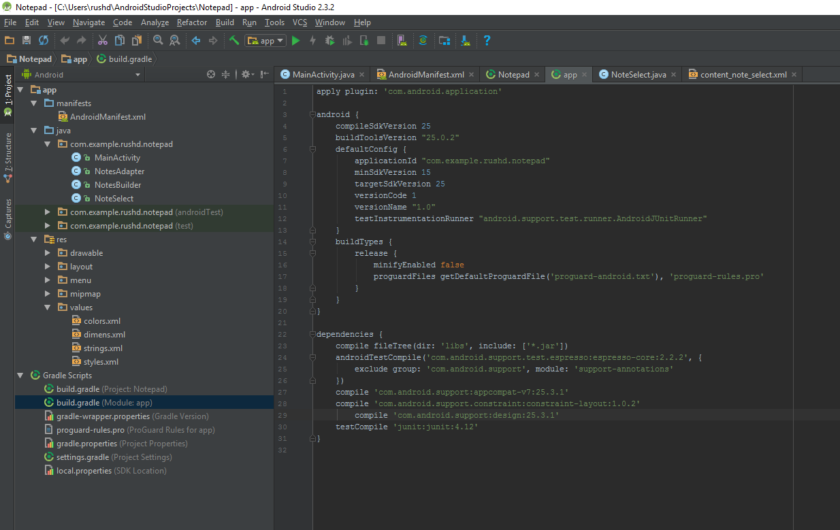 Например, вы могли заметить, что Android Studio иногда упоминает Gradle. Это «инструмент автоматизации сборки», который по сути помогает Android Studio превратить все эти разные файлы в один APK. Вы должны иметь возможность оставить Gradle делать свою работу большую часть времени, но иногда вам нужно будет переходить к файлам build.gradle, если вы хотите добавить новую «зависимость», позволяющую расширенные функции для вашего приложения. Иногда, если что-то перестает работать, вы можете выбрать «Сборка»> «Очистить проект», и это по сути подтвердит, где находятся все файлы и каковы их роли. Обычно таких файлов сборки Gradle будет два: один для всего проекта и один для «модуля» (приложения).