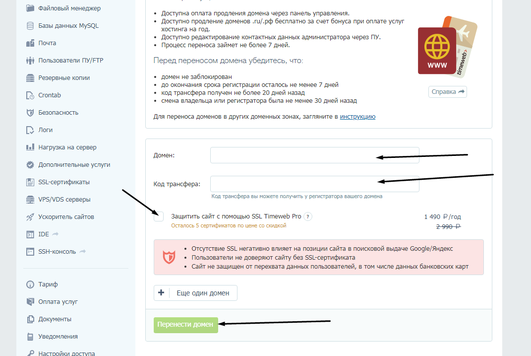 В соответствующем поле указываем ссылку и код трансфера, полученный от регистратора. Можно подключить дополнительно защиту с помощью SSL-сертификата. По окончании настройки жмем на кнопку «Перенос домена».