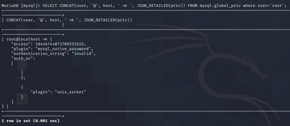 SELECT CONCAT(user, '@', host, ' => ', JSON_DETAILED(priv)) FROM mysql.global_priv where user='root';