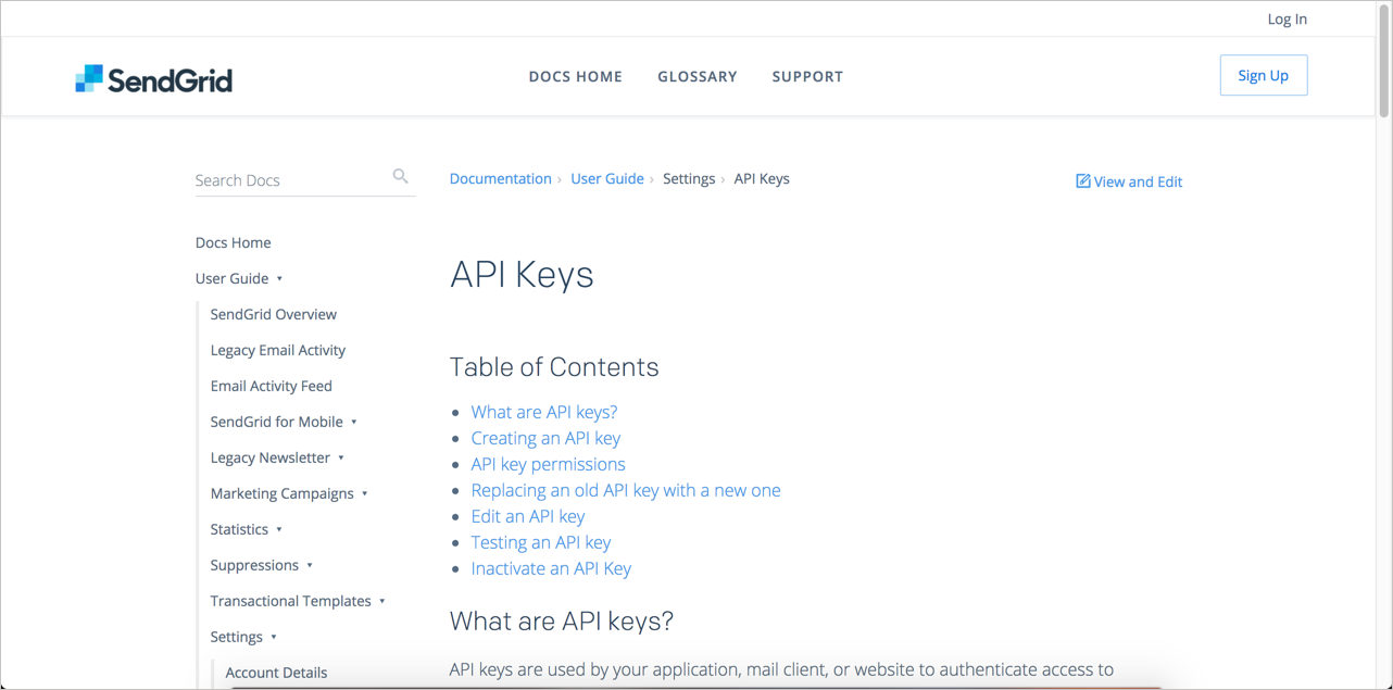 SendGrid предлагает подробное объяснение ключей API, начиная с основ, поясняя: «Что такое ключи API?». Контекстно раздел ключей API появляется вместе с другими разделами по управлению учетными записями.
