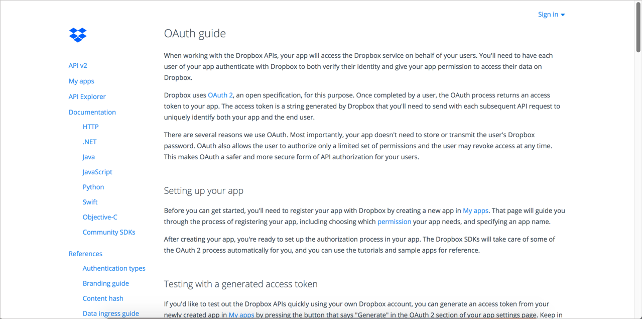 Как и Twitter, Dropbox также использует OAuth 2.0. Их документация включает в себя не одну, а две диаграммы и подробное объяснение процесса.